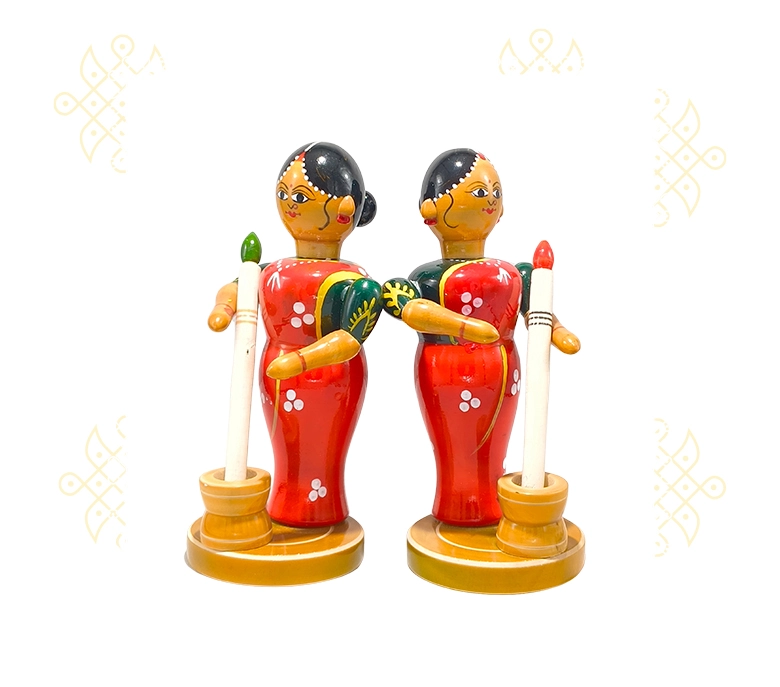 Bring home a slice of Indian rural life with this beautiful Handcrafted Etikoppaka Rokali Set, featuring 2 wooden lady figurines engaged in the traditional rice-pounding activity. This set, crafted by skilled artisans of Etikoppaka, reflects the cultural heritage and charm of village life, preserving the timeless art of lacquerware. Home Décor: Add a traditional touch to your living room, study, or showcase with this charming artifact. Cultural Collectible: A valuable addition to any collection of Indian handicrafts or traditional toys. Unique Gifting Option: Ideal for gifting during festivals, weddings, anniversaries, or housewarming ceremonies. Educational Purpose: Helps teach children about rural Indian practices and traditional crafts. Cultural Showpiece: Great for exhibitions or as a centerpiece in cultural events.